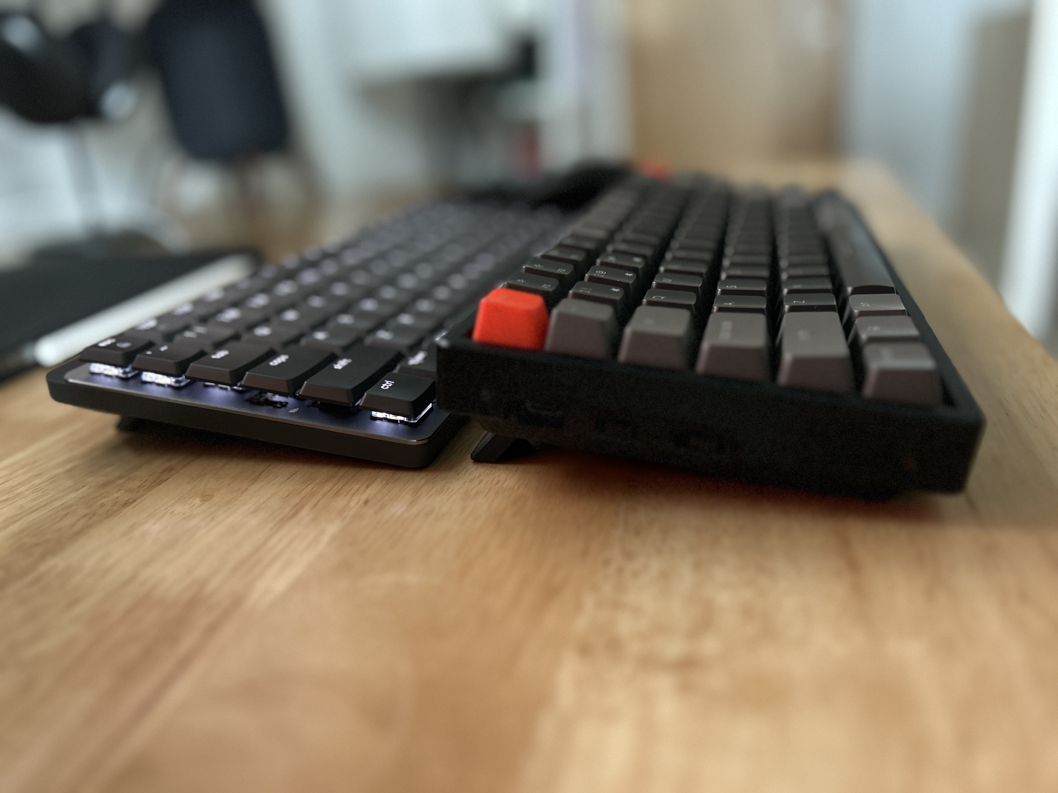 이 제품은 매니아들을 타깃으로 제품이 나온 것은 아니다. 다만 사진에서 보이겠지만 일반적인 기계식 키보드에 비해 엄청나게 얇다. 받침대 없이 손목을 바닥에 놓고 타이핑이 가능하다. 기계식 키보드들은 로우프로파일 타입이 아니면 전반적으로 높이가 높은 형태이다.